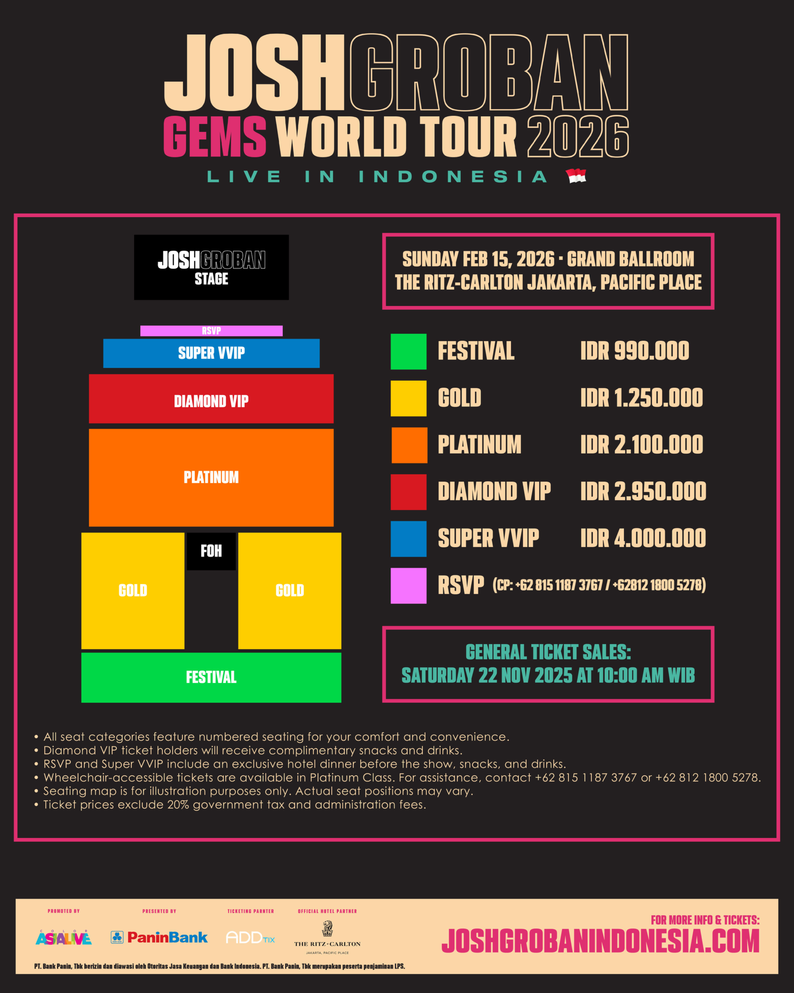 • General ticket sales: Saturday, 22 November 2025 at 10.00 WIB, and tickets can be purchased through the official website at www.joshgrobanindonesia.com, with limited seats available for this exclusive one-night-only show.“Bringing Josh Groban to Jakarta for Gems World Tour 2026 as part of a Valentine’s celebration is a dream project for us,” said David Ananda, Managing Director of Color Asia Live. “His voice, his artistry, and the emotional connection he builds with audiences around the world make him the perfect artist for such a special occasion. We’re excited to present a beautiful, elegant evening that fans in Indonesia will remember for years to come, proudly presented by Panin Bank.”“Presenting Josh Groban’s ‘Gems World Tour 2026’ in Jakarta is a true honour for Panin Bank. We believe that great music has the power to inspire, connect, and create lasting memories, values that are very much aligned with our commitment to our customers. We look forward to welcoming them to an unforgettable Valentine’s evening with Josh Groban. For more information, please contact the nearest Panin Bank branch or call centre; our special offers for Panin Bank customers are a reflection of our dedication to providing meaningful experiences beyond banking.” said Sugiono Sutanto Janis - Director of Panin Bank.
