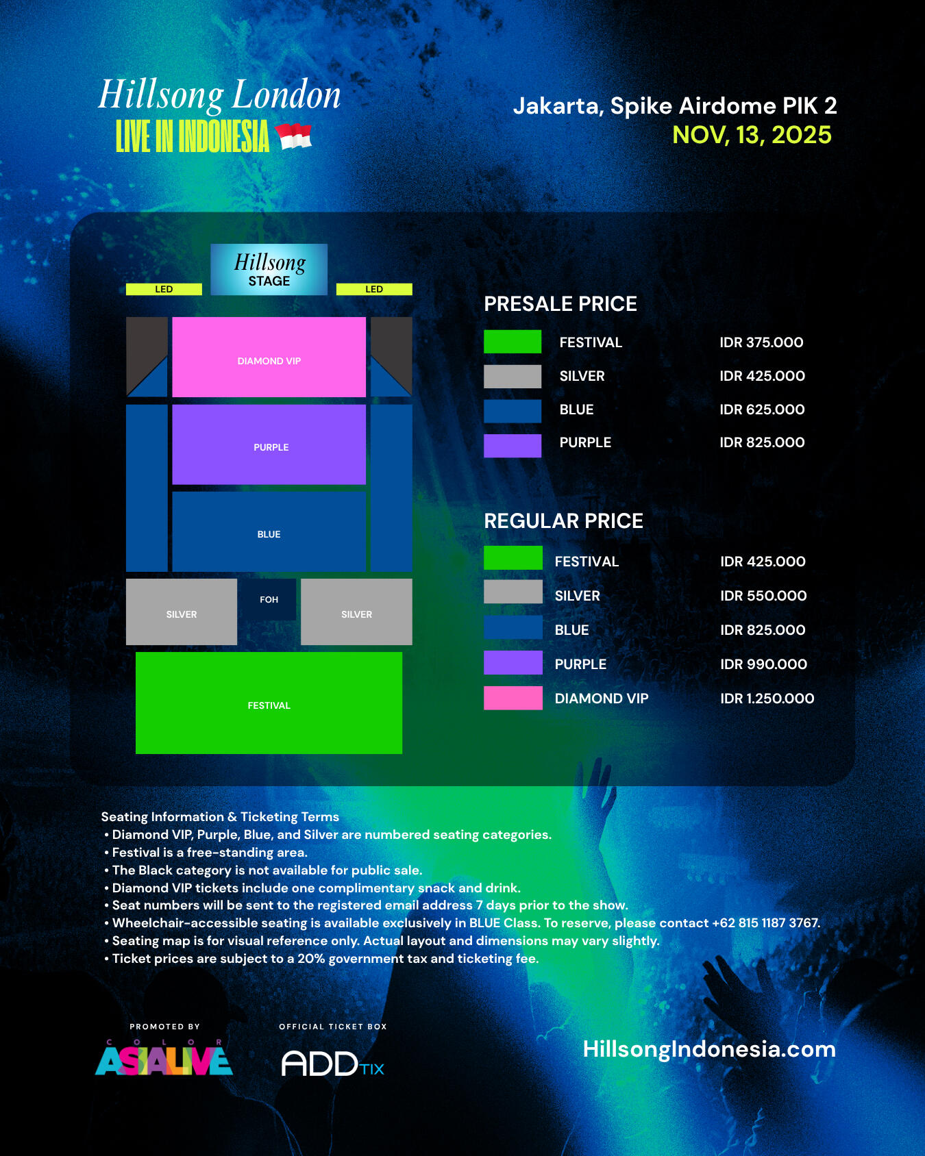 Jakarta, 18 Juli 2025 – Calling all gospels music lover! Hillsong London, grup musik gospel dari Inggris yang dikenal luas dengan nyanyian pujiannya (worship) yang menginspirasi, dengan bangga mengumumkan rencana konser mereka di Spike Airdome, PIK 2, Jakarta, 13 November 2025 mendatang.Tiket untuk konser spektakuler dan joyfull ini bisa didapatkan mulai tanggal 21-23 Juli 2025 pukul 11:59 WIB untuk tiket dengan harga Presale, dan tanggal 24 Juli 2025 pukul 11:59 WIB untuk tiket dengan harga Regular, melalui aplikasi ADDtix dan laman www.hillsongindonesia.com.Kedatangan Hillsong London ke Indonesia, khususnya Jakarta, dalam rangkaian Tur Asia mereka pada November 2025 ini, menandai momen penting bagi para penggemar musik gospel dan komunitas gereja di tanah air. Grup ini telah menjadi fenomena global dengan lagu-lagu mereka yang menyentuh hati dan pesan harapan yang kuat seperti Oceans (Where Feet May Fail), What A Beautiful Name, How Great Is Our God, Shout Your Fame, dan Broken Vessels (Amazing Grace), yang telah menginspirasi dan menyatukan jutaan orang dari berbagai latar belakang di dunia.David Ananda, Managing Director Color Asia Live, menyatakan kegembiraannya menghadirkan Hillsong London ke Jakarta dan mengajak para pecinta musik gospel di Indonesia menikmati malam penuh pujian. "Kami percaya bahwa musik memiliki kekuatan untuk menyembuhkan, menginspirasi, dan menyatukan.” ujar David. “Konser ini akan menjadi kesempatan luar biasa bagi kita semua untuk merasakan kehadiran Tuhan dan merayakan iman bersama.”Ia juga menjelaskan bahwa Spike Airdome PIK 2 dipilih sebagai lokasi karena kapasitasnya yang representatif dan suasana modern yang mendukung pengalaman konser yang imersif. Dengan tata panggung dan sistem suara berkelas dunia, penonton akan merasakan kekuatan dari setiap nada dan lirik dari lagu-lagu Hillsong London yang menggugah hati. “Kami berharap konser ini dapat dinikmati bukan hanya oleh warga Jakarta, tetapi juga dari berbagai kota di Indonesia,” tutup David.